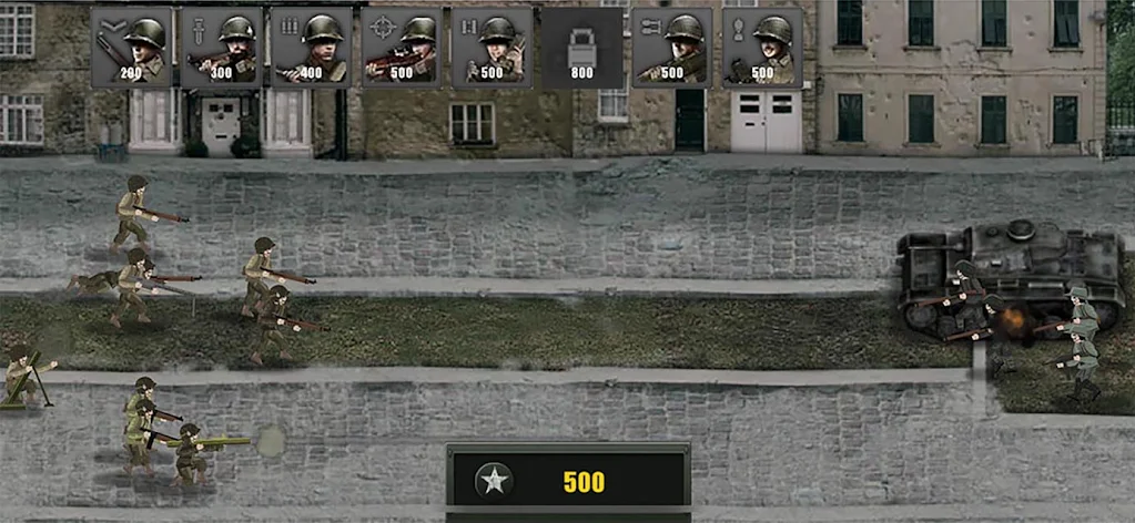 通过按下顶部的按钮来招募和控制部队,金钱会自动加班并消除敌人