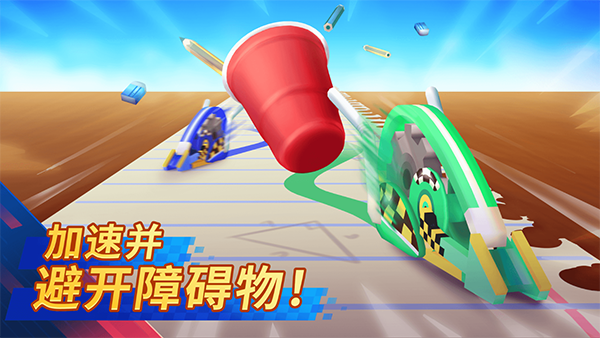 与其他两位赛车手竞争,在纸上方竞赛并避开各种障碍物