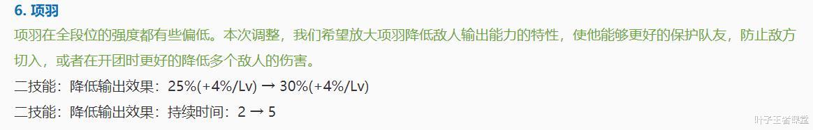 这个改动大家伙都是清楚的,前几日在体验服也是将项羽的二技能降输出能力提高到了50%,持续时间增加到了5s。