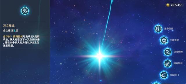 解锁1命,雨帘剑数量从3柄变4柄。解锁2命,大招从15秒延长至18秒,由于加成时间较长,实际游戏中应尽量由行秋先手开大招。这两个命座比较简单,不多说。