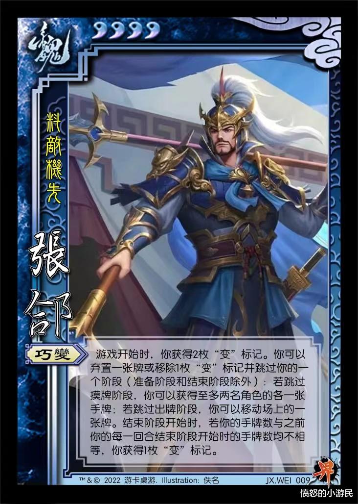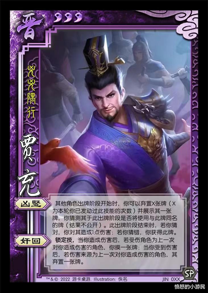 OL界曹真是吧?猜牌大师,猜对造成1点伤害,猜错也就回收。奸回是个你打我我打你的锁定技,自己要是有连弩那就成了“我自横扫天下,蔑视群雄又如何?”,总体来说设计比海外版差远了。