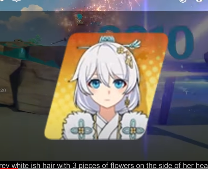 She has grey white-ish hair with 3 pieces of flowers on the side of her head, and wear flower pattern clothing, the face is looks like Theresa from Honkai Impact.