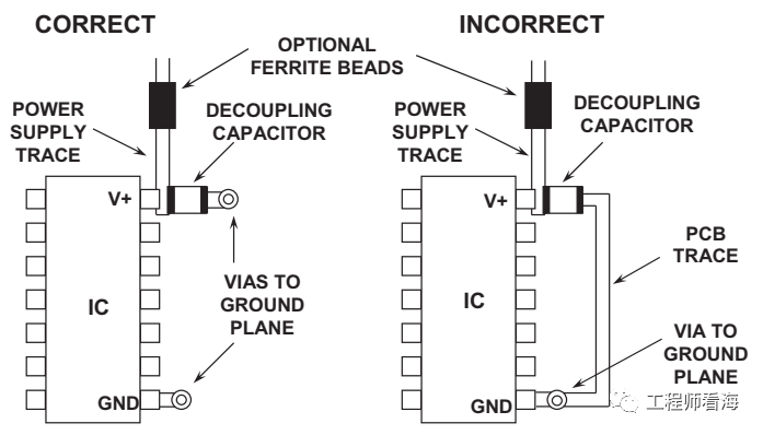 图2显示了此方法,图示左侧为正确实施方案,右侧为错误实施方案。左侧示例中,典型的0.1 μF贴片陶瓷电容借助过孔直接连接到PCB背面的接地层,并通过第二个过孔连接到IC的GND引脚上。相比之下,右侧的设置不太理想,给去耦电容的接地路径增加了额外的PCB走线电感,使有效性降低。(有条件把贴片电容放在芯片背面正下方效果更好。)