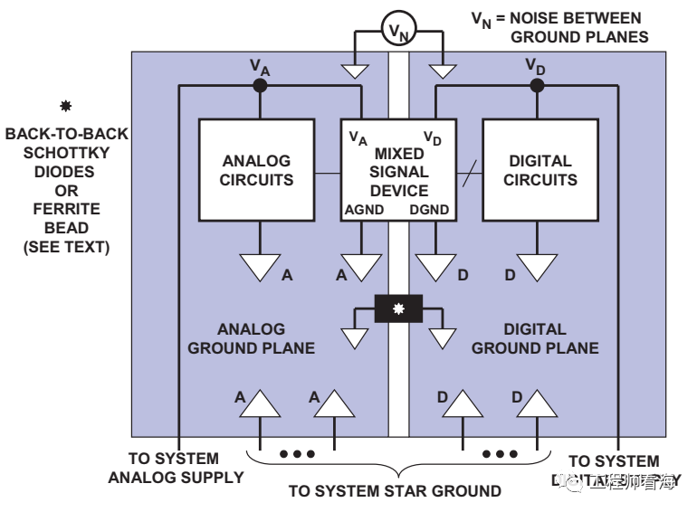 在使用了大量数字电路的混合信号系统中,最好在物理上分离敏感的模拟元件与多噪声的数字元件。另外针对模拟和数字电路使用分离的接地层也很有利。避免重叠可以将两者间的容性耦合降至最低。分离的模拟和数字接地层通过母板接地层或“接地网”(由连接器接地引脚间的一连串有线互连构成),在背板上继续延伸。如图4所示,两层一直保持分离,直至回到共同的系统“星型”接地,一般位于电源端口。接地层、电源和“星型”接地间的连接应由多个总线条或宽铜织带构成,以便获得最小的电阻和电感。每个PCB上插入背对背肖特基二极管,以防止插拔卡时两个接地系统间产生意外直流电压。此电压应小于300 mV,以免损坏同时与模拟和数字接地层相连的IC。推荐使用肖特基二极管,它具有低电容和低正向压降。低电容可防止模拟与数字接地层间发生交流耦合。肖特基二极管在约300 mV时开始导电,如果预期有高电流,可能需要数个并联的二极管。某些情况下,磁珠可替代肖特基二极管,但会引入直流接地环路,在高精度系统中会很麻烦。