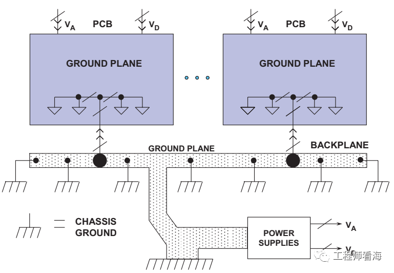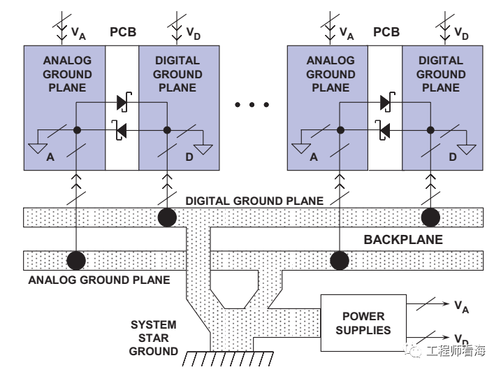 所有高噪声数字电流通过数字电源流入数字接地层,再返回数字电源;与电路板敏感的模拟部分隔离开。系统星型接地结构出现在混合信号器件中模拟和数字接地层连接在一起的位置。该方法一般用于具有单个PCB和单个ADC/DAC的简单系统,通常不适合多卡混合信号系统。在不同PCB(或适用情况的相同PCB)上具有数个ADC或DAC的系统中,模拟和数字接地层在数个点连接,使得建立接地环路成为可能,而单点“星型”接地系统则不可能。鉴于以上原因,单点接地方法不适用于多卡系统,上述方法应当用于具有低数字电流的混合信号IC。