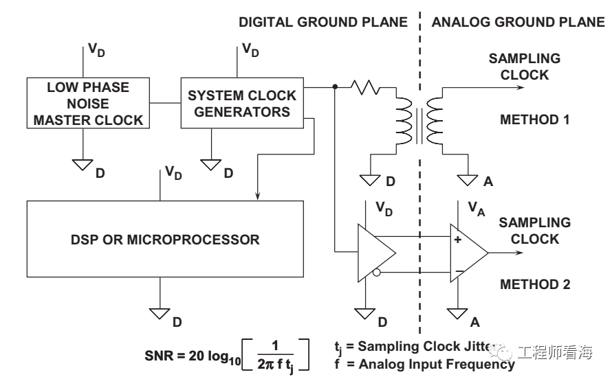 采样时钟发生电路应与模拟电路同样对待,也接地并深度去耦至模拟接地层。采样时钟上的相位噪声会降低系统SNR,下文将予以讨论。