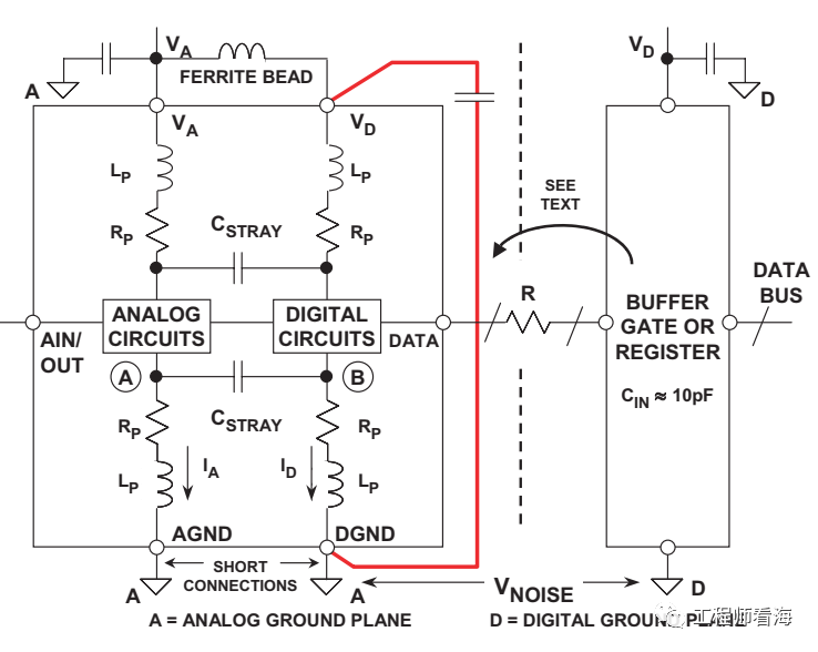 同时具有模拟和数字电路的IC(例如ADC或DAC)内部,地端口通常保持独立,以免将数字信号耦合至模拟电路内。图5显示了一个简单的转换器模型。将芯片焊盘连接到封装引脚难免产生线焊电感和电阻,IC设计人员对此是无能为力的,心中清楚即可。快速变化的数字电流在B点产生电压,且必然会通过杂散电容CSTRAY耦合至模拟电路的A点。此外,IC封装每个引脚间约有0.2pF的杂散电容,同样无法避免!IC设计人员的任务是排除此影响让芯片正常工作。不过,为了防止进一步耦合,AGND和DGND应通过最短的引线在外部连在一起,并接到模拟接地层。DGND连接内的任何额外阻抗将在B点产生更多数字噪声,继而使更多数字噪声通过杂散电容耦合至模拟电路。请注意,将DGND连接到数字接地层会在AGND和DGND引脚两端施加VNOISE,带来严重问题!