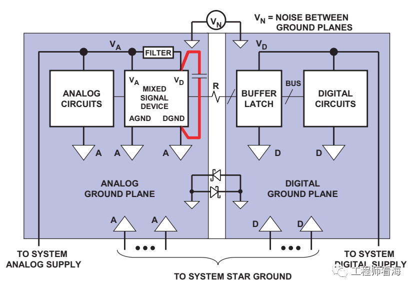 图9总结了上述具有低数字电流的混合信号器件的接地方法。由于小数字瞬态电流流入去耦电容VD与DGND(显示为粗实线)间的小环路,模拟接地层未被破坏。混合信号器件适合作为模拟元件的所有应用。接地层间的噪声VN会降低数字接口上的噪声裕量,但如果使用低阻抗数字接地层保持在300 mV以下,且一直回到系统星型接地,则一般无不利影响。