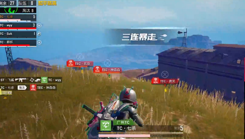 在第四轮第六局的雨林地图里面,TC战队表现就非常不错。赛事还有一半才结束的情况下,TC战队已经拿下了9个淘汰。而此时的TC战队,正在和TEC战队激战。而TC战队一方一人已经被淘汰,两人则被击倒在地。此时七杀一人面对敌方三人,完全不慌。凭借自己设计的路线,1V3的情况下,将TEC战队给灭队!