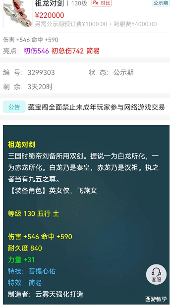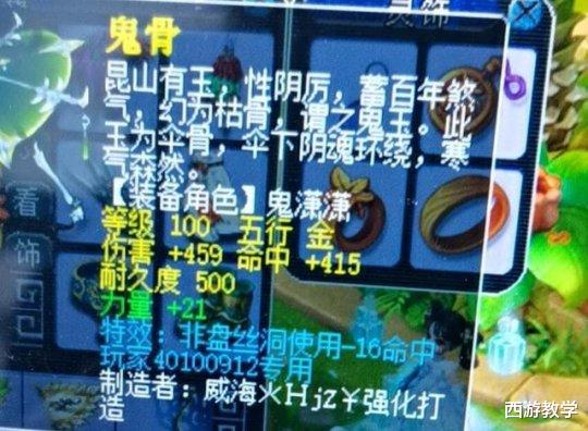 这个也是最近新出的一个专用武器,伤害+459,命中+415,力量+21,可惜是非盘丝洞使用减少16命中,你们猜猜这个武器是怎么出的?