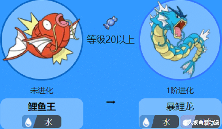 又是一个鱼类宝可梦,其实也是真的好玩,《宝可梦》中这种跨形态差异最大的进化,基本上都和水中的宝可梦有关系。而鲤鱼王进化成暴鲤龙,动漫中也提到过这一点,毫无疑问是取自于“鲤鱼跃龙门”的传说。而鲤鱼王在进化之前,不出意外的话,就是整个宝可梦中最没用的精灵了,除了“水溅跃”外啥都不会,可一旦发生进化,那么就是著名的“大凶残”了。