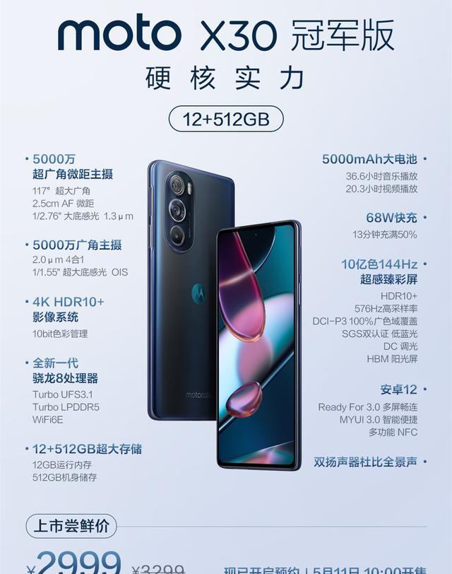 5月10日消息,摩托罗拉正式发布了motoedgeX30冠军版:该机拥有12GB+512GB大存储,起售价仅为2999元,是目前性价比最高的骁龙8Gen1手机。标准版本也开启降价促销模式,8GB+128GB版到手价仅为2399元,有需求的网友可以关注一下。