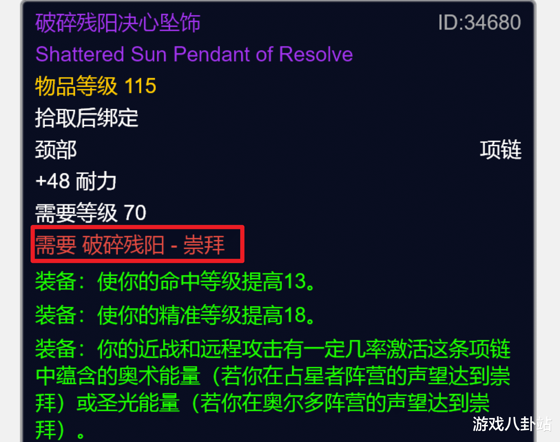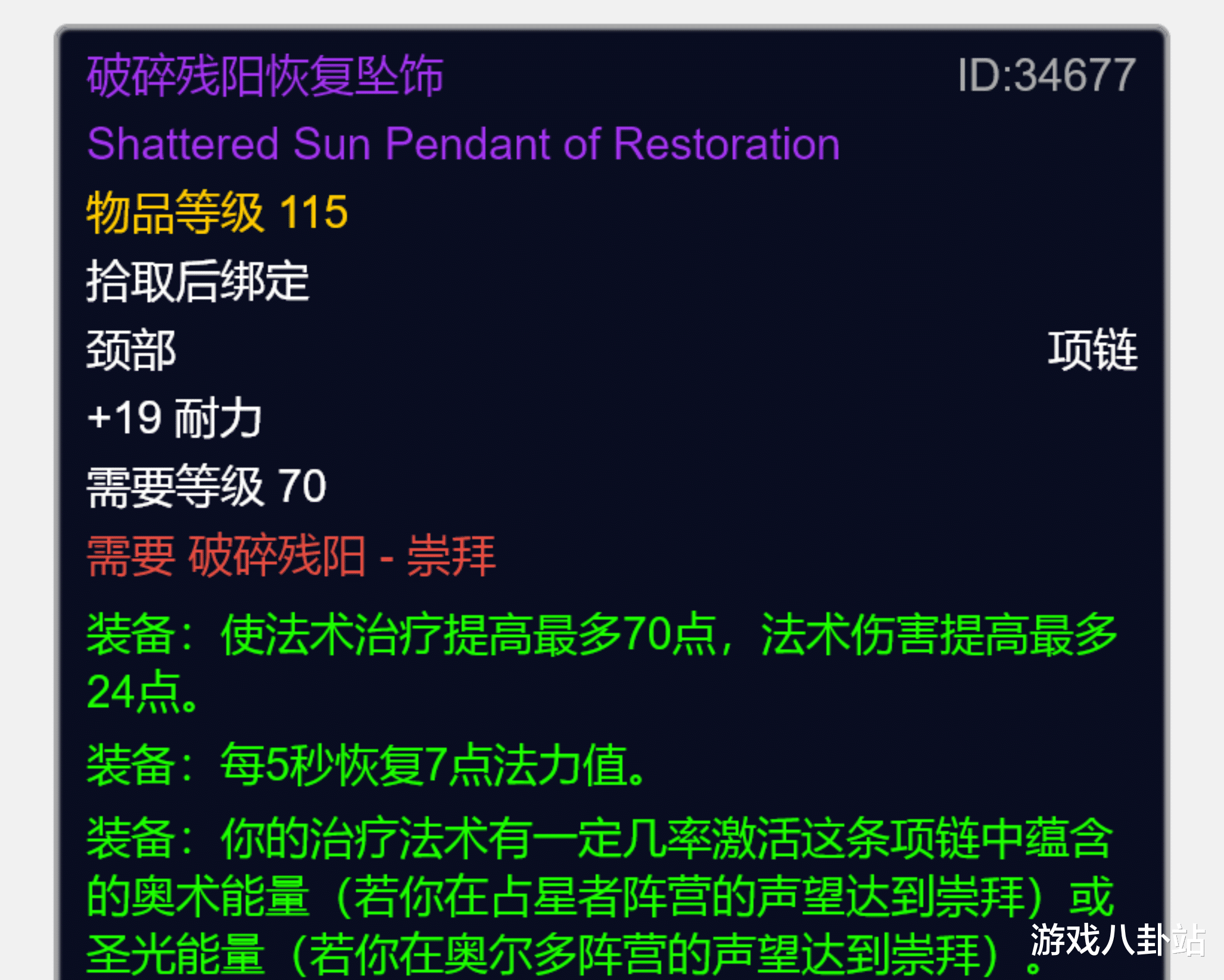 进入到P5阶段以后治疗职业压力十分大,而在破碎残阳中玩家们可以拿到的一个治疗项链便是破碎残阳恢复坠饰,该项链要求玩家们的声望打到崇拜,并且该饰品最多可以提高70点的治疗并且每五秒恢复7点法力值,不过在使用治疗术的时候还有一定的几率激活蕴藏在这条项链的奥术能量,不过该装备对比于BIS项链还有一定的差距,但是对于普通玩家来说已经足够了。