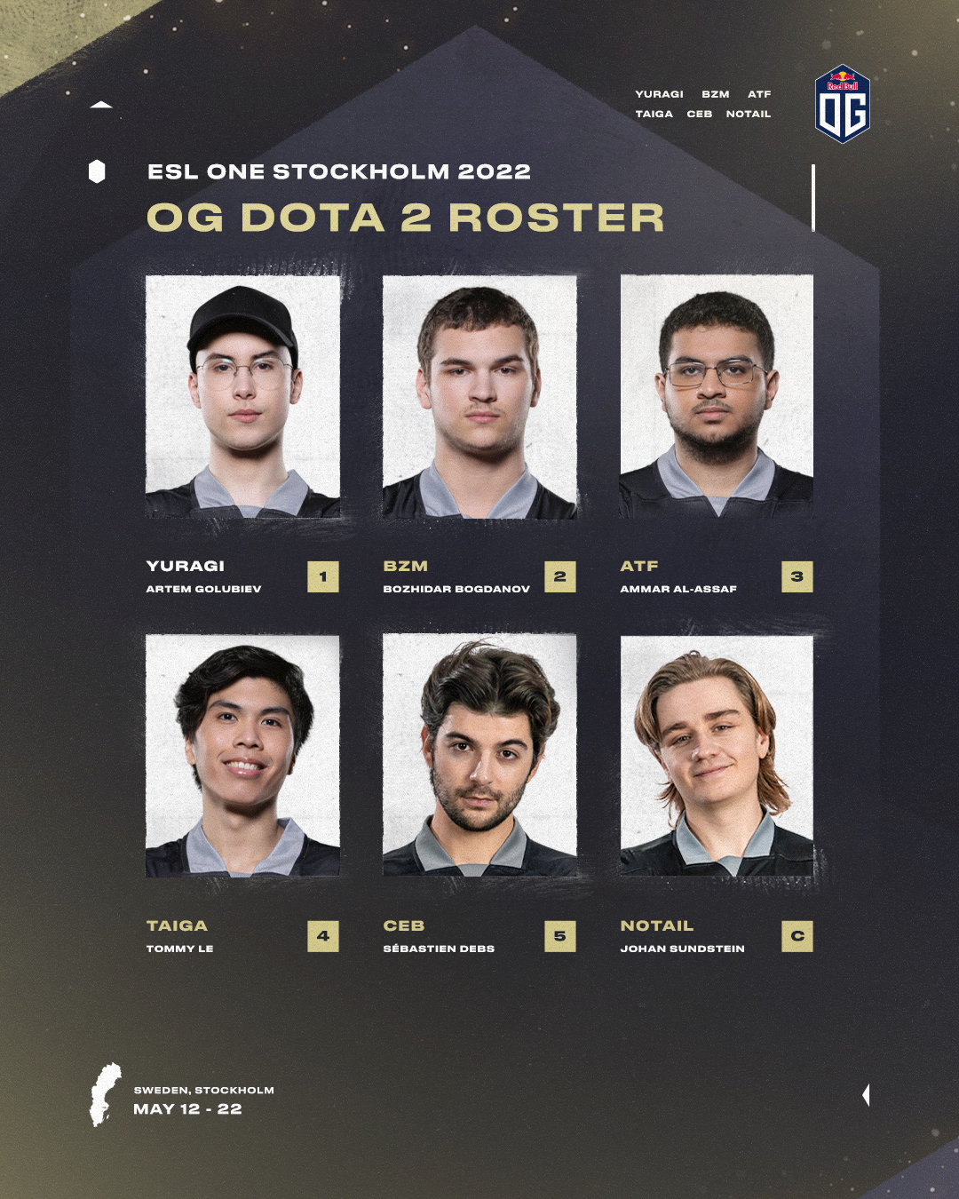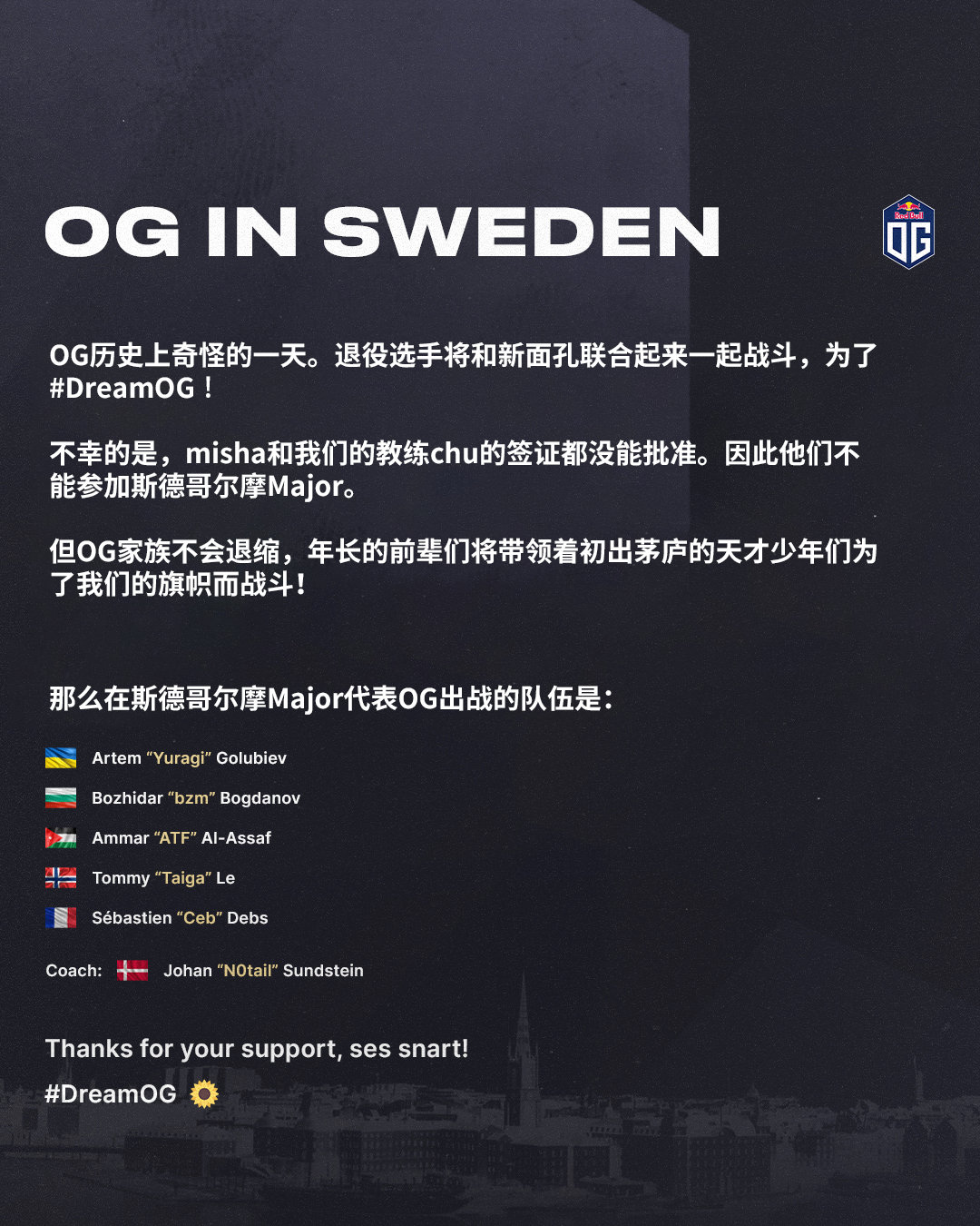 2022年5月11日,正当大家期待着看一下这支新OG的实力之时他们却突然官宣道:“由于一些原因,我们不得不在Major前更改阵容,由Ceb和N0taiL替补出战,年长的前辈们将带领着初出茅庐的小伙子们为了我们的旗帜而战斗!”