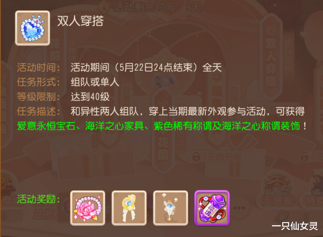 此外,还有一点不得不提,这套主题全新时装还强行加上了双人外观的名头,如果在活动期间组队买了这一套,可免费领取纪念道具爱意永恒宝石、海洋之心家具、紫色稀有称谓及海洋之心称谓装饰。但是懂的都懂,肯定也是概率的,不可能让你打包带回家。