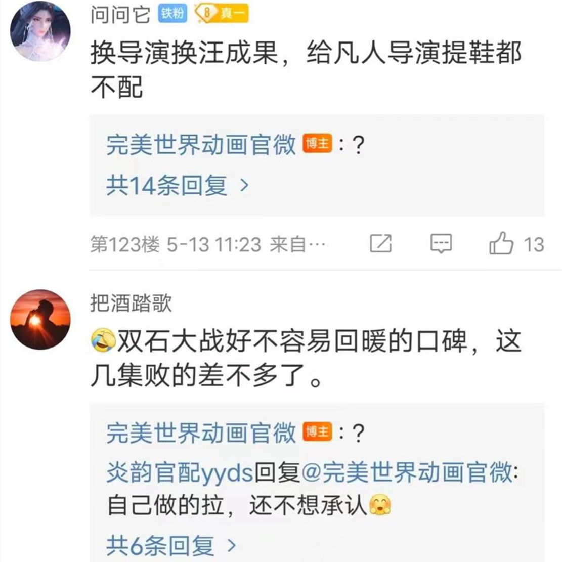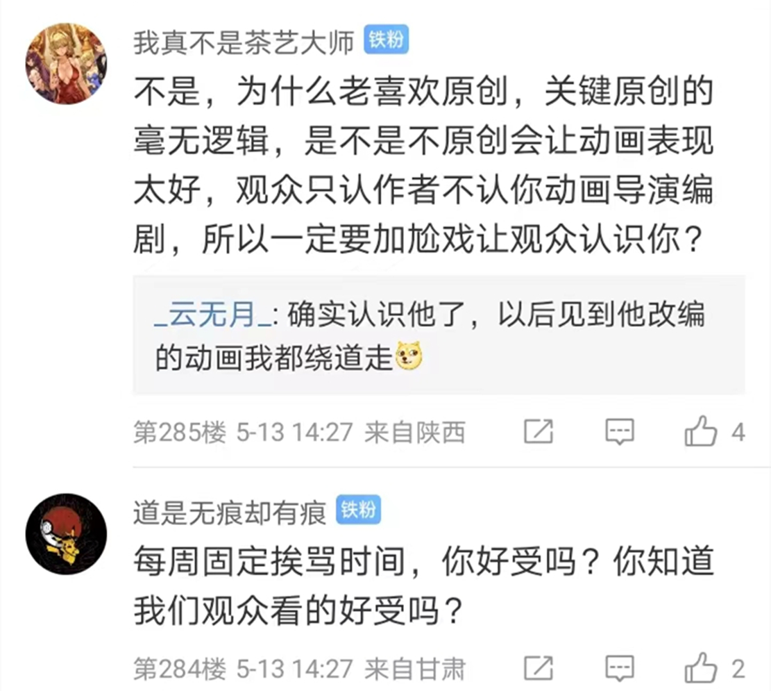 确实现在《完美世界》动漫加入了太多的原创剧情,虽然说这些原创剧情不像是《斗罗大陆》一样拖慢了剧情进度,但是这些原创剧情做得却并不是很好。而且现在《完美世界》动漫魔改剧情的问题越来越严重,改编的效果不但没有得到网友的认可,反而是引起了不少网友的不满,因此不少网友也都纷纷在官博进行吐槽。