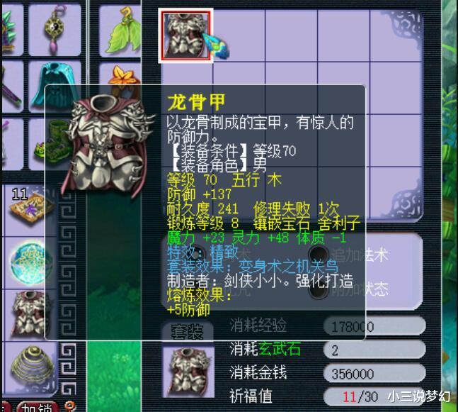 小编刚开始还以为自己看错了呢,后来才发现,原来上面的这位玩家真的是在给一件70级,只有着精致,没有简易效果的装备点化套装,从已经使用的附魔宝珠的记录来看,上面的这件装备已经被使用了11个附魔宝珠了,现在点化出来的机关鸟套装,虽然能够使用,但是考虑到这件装备的属性,小编感觉上面的这个玩家还需要继续点套装。
