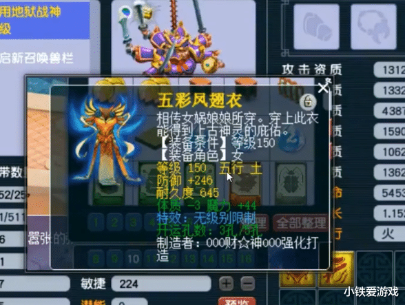 在看属性之前,老王还夸赞了一下女衣服。他说这样的东西没有男铠甲贵,可是出好东西也,那是一样的值钱。我们看到装备就只开了3孔,还有2孔未完成。另外就是套装也没有点化,宝石更加就没有上了。