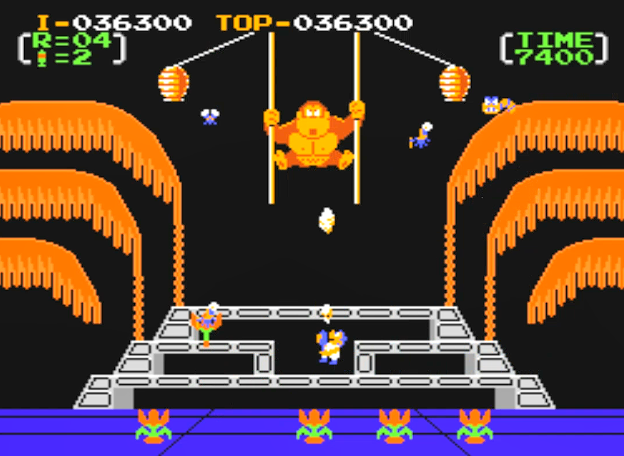 《大金刚3》发行时间是1984年7月,故事背景为大猩猩侵入史丹利的温室,想让蜜蜂来破坏史丹利培养的花,史丹利必须阻止这头猩猩和狂躁的蜜蜂。
