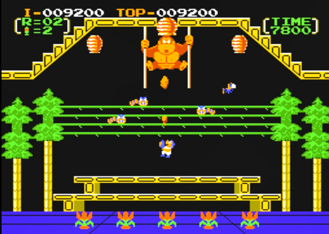 游戏场景只有三个,采用无限循环的模式,越到后面越困难,但是在前面几关,还是非常简单了,玩家扮演的史丹利需要用水枪(杀虫剂)不停的喷射大猩猩,还有就是飞下来的蜜蜂,阻止蜜蜂把花搬走。至于毛毛虫,那普通的水枪是不能消灭的。需要吃到强力的杀虫剂才可以,而强力杀虫剂就是喷射大猩猩时,它上升到一定高度,右边那个写有“R”的瓶子就会掉落下来,吃到后火力就会变强,也可以消灭毛毛虫,可惜的是有时间限制,用不到两关就会消失,最多应该可以用3-4关。强力杀虫剂第一关会出现,之后的出现条件好像需要史丹利挂掉一次才可以。