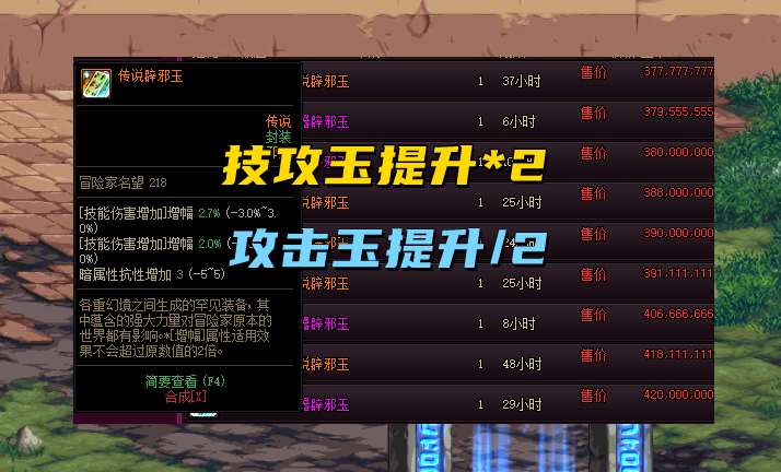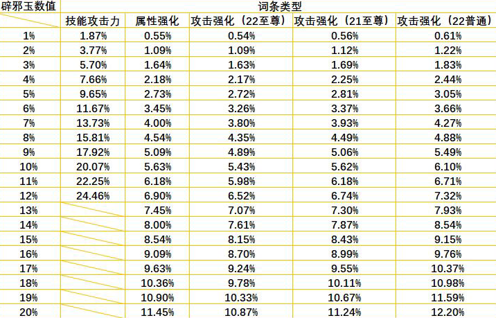 3、关于辟邪玉的大概提升,可以归纳成这样一句话【技攻玉乘以2;属强玉/攻击玉除以2】,同样以10%词条为例,技攻玉大概提升20%,属强玉/攻击玉大概提升5%,如此就简单明了。