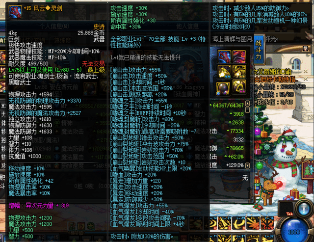 下面这把+15的风云灵剑有点强了就,1500的攻击力加成,+108的力量,抗魔值+1000,移动速度,施法速度+10%,双暴击率+10%,其他的技能属性增强词条更是多到满屏!