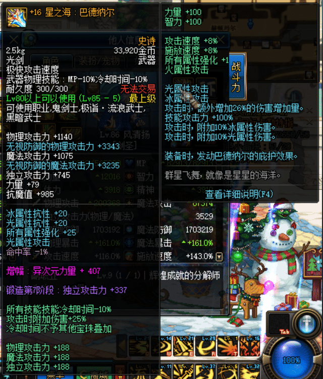 1100的攻击力,抗魔值+985,力量+79锻造7阶段,攻击力+337,其他属性加成大家看图可以了解。