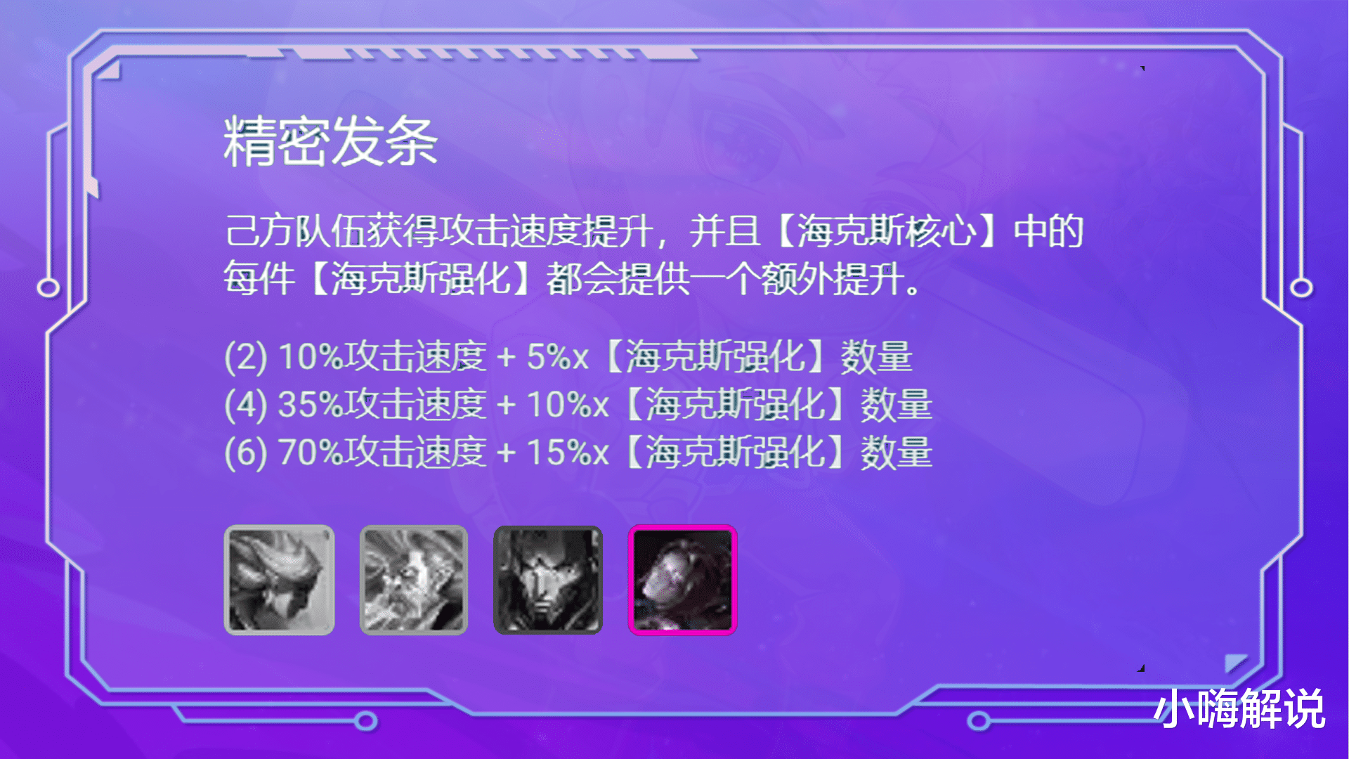 其次阵容核心是精密发条,4精密在后期能够提供65%的攻速加成,而杰斯的技能能增加50%攻速。因此阵容即使没有羊刀,只要杰斯启动就能够造成大范围性的AOE伤害。