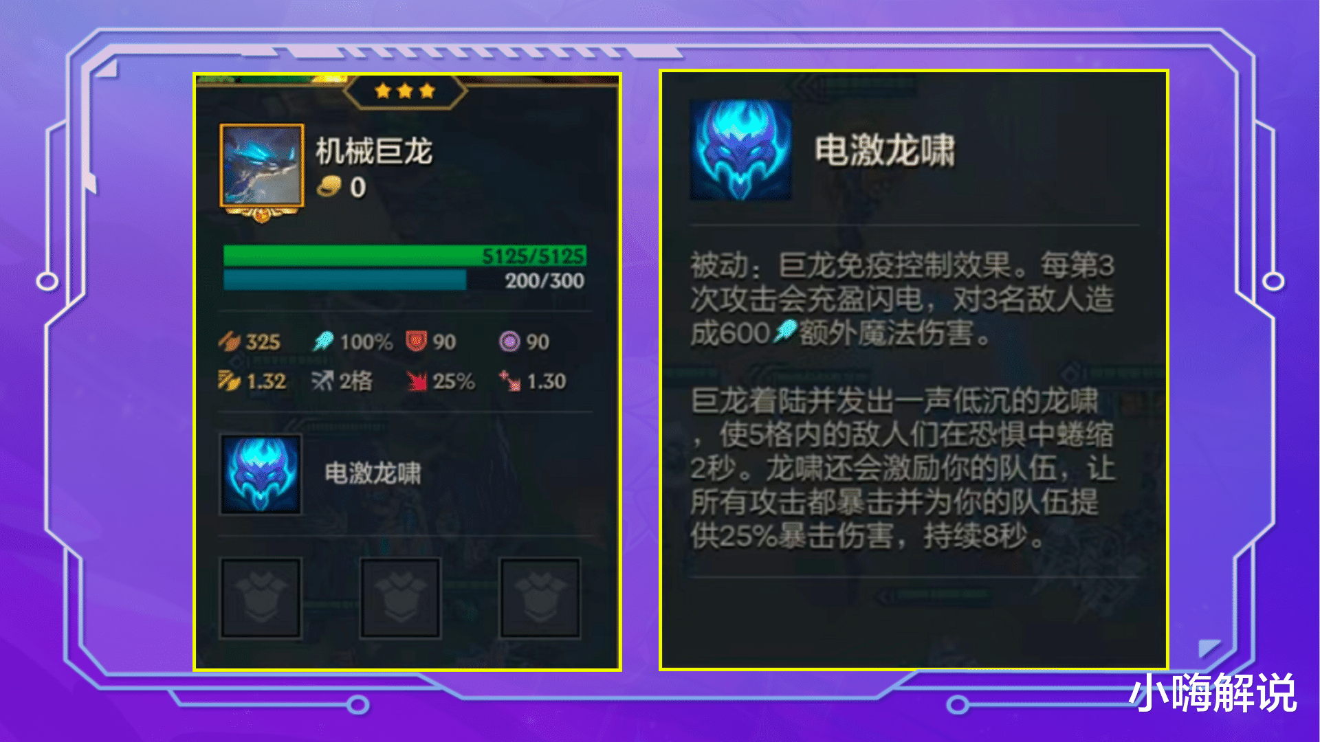 其次巨龙的主动技能能够嘲讽对面敌人2秒,这个嘲讽非常重要,一场游戏只要能够嘲讽2次就能够给我方阵容带来4秒的输出时间,基本上这个时间就足够输出带走对面。此外技能还能够给有队提供25%的暴击伤害,并且所有普攻能够造成暴击,极大的提高了阵容物理输出伤害。