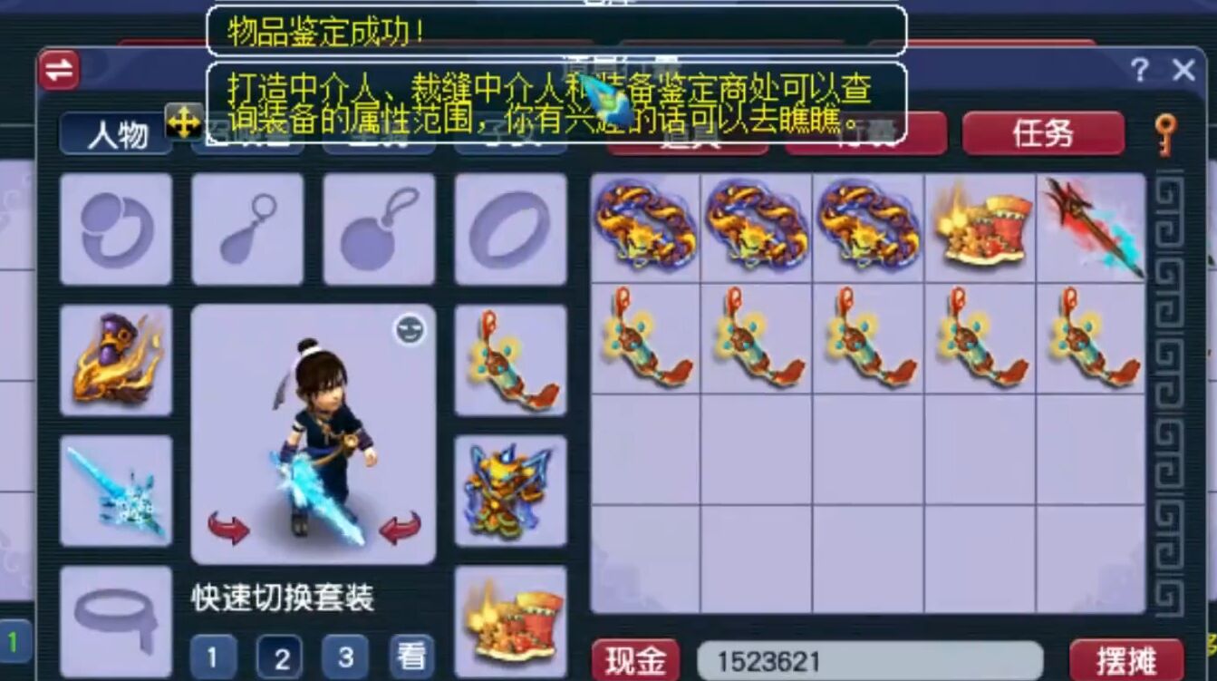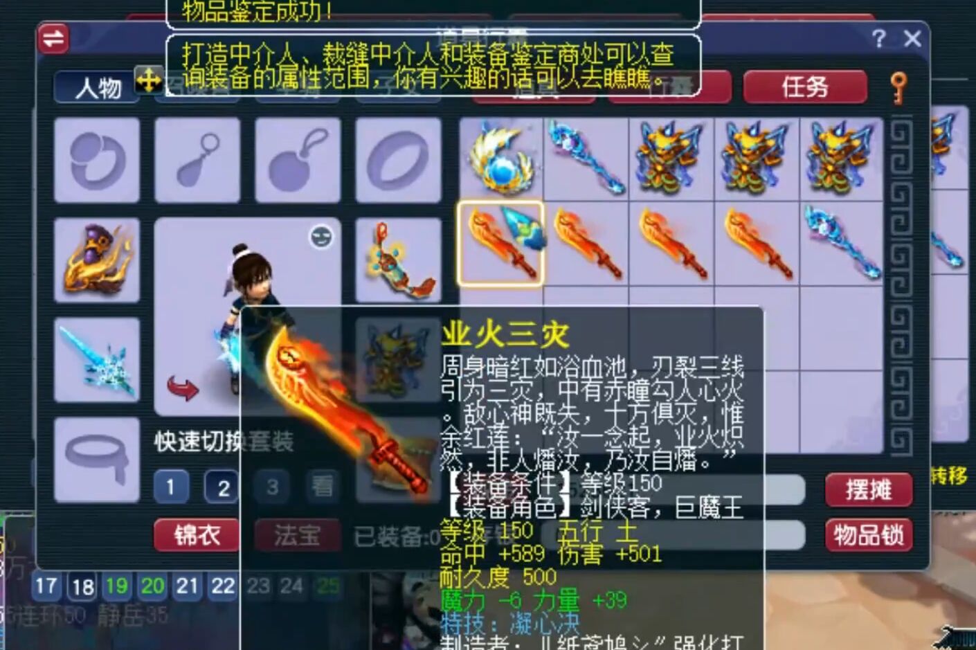 鉴定过程没有弹出任何成就点,那么就以为着不会出现无级别特效,出现其它极品蓝字的几率也微乎其微了。第一把武器附加了特技凝心诀,单加力量39,伤害501,命中589。单加属性与特技是有了,但是都不值钱。