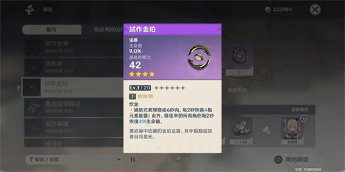 试做金珀的优点主要凸显在泛用性很强,像凝光,莫娜,砂糖等都可以使用,试做金珀副属性提供生命值,对于依赖生命的奶妈非常契合,而且就算不依赖生命的非奶妈角色也可以通过特效回血为全队提供血量回复。